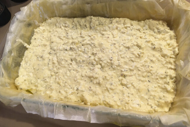 Pour in cheese filling and use a spatula to distribute evenly across pan. Fold in loose phyllo edges and then layer about another 6 to 8 phyllo pieces, again coating well with the butter and oil.