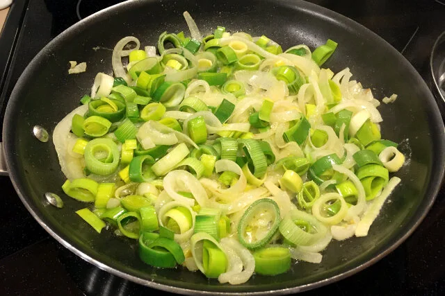 Lower the heat slightly, add the leeks, and cook for another 10 minutes or until soft. Set aside to cool.