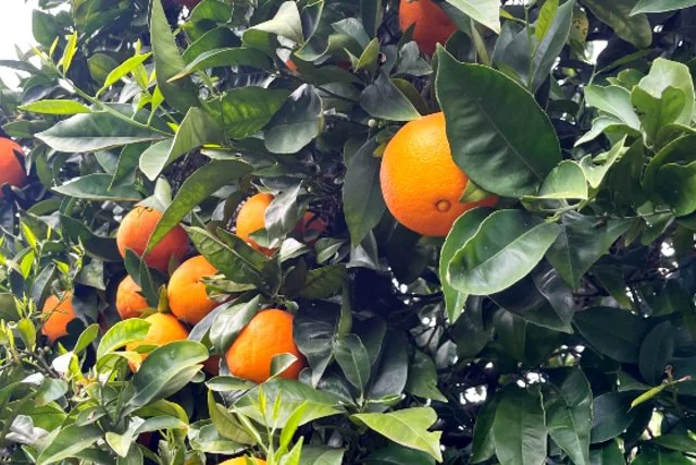 Several small orange tree boughs with their leaves, rinsed and dried